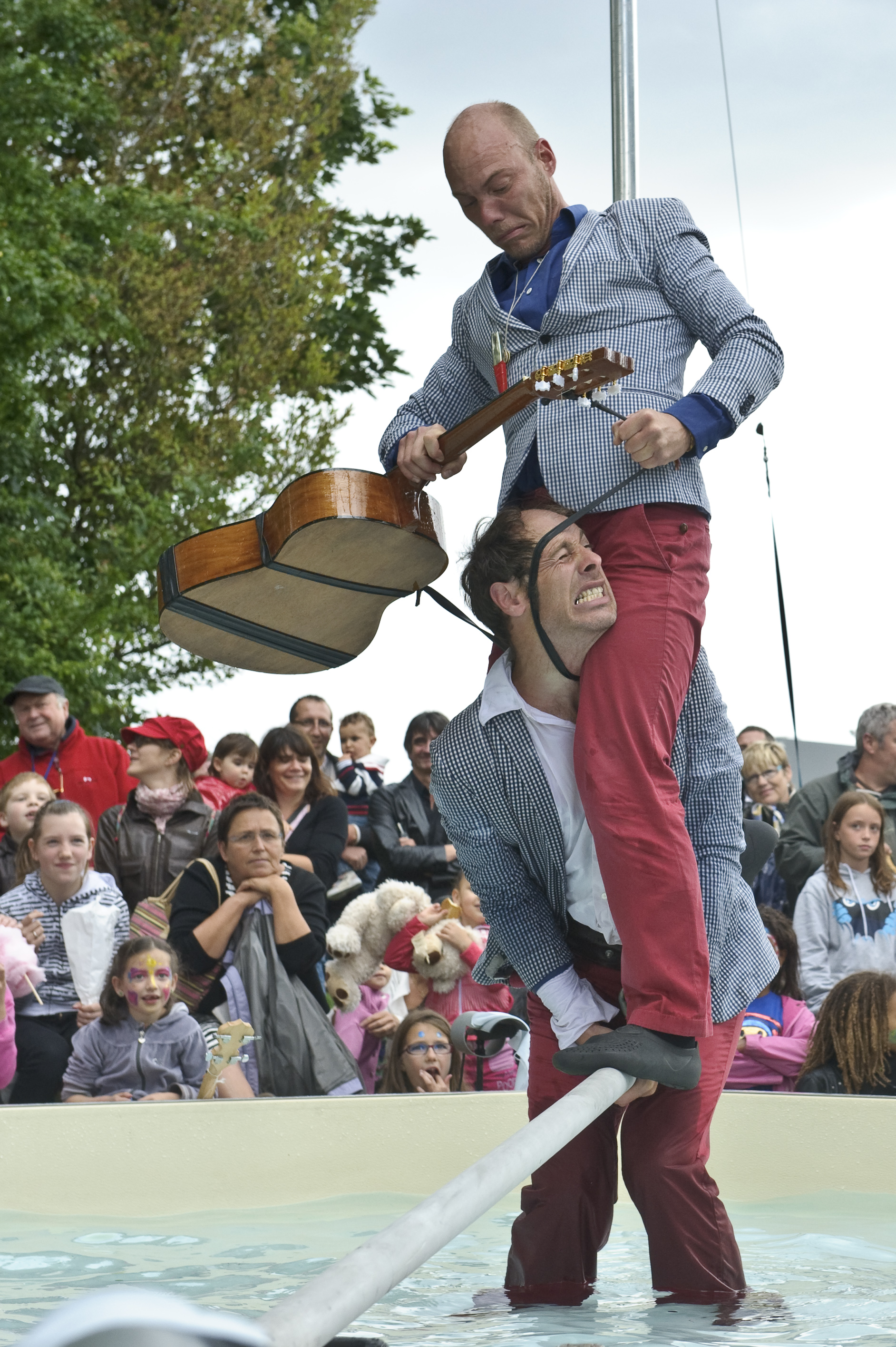 Un kiosque au milieu d’un square ou de la place d’un village. Quoi de plus normal, sauf si celui-ci est rempli d’eau. Le duo qui vient s’y produire va alors devoir s’y faire, mettre les pieds dans l’eau ou pas telle est alors la question…Si l’un ne rechigne guère à se mouiller et utilise toutes les ressources plastiques et musicales de cet élément, l’autre la craint comme la peste et s’ingénie pour l’éviter…