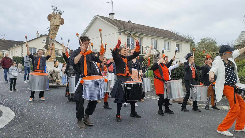 Une vingtaine de percussionnistes pour un savoureux mélange de samba du Bocage et du Brésil, le tout en orange à pois et à rayures, une fanfare reconnaissable entre mille !