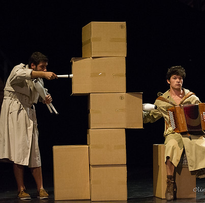 Inbox est la première création de Soralino. Une illustration domestique du mythe de Sisyphe1, où deux types en imper – le petit habillé trop grand et le grand habillé trop petit – jouent du carton (un gros parallélépipède, c’est coton à manier), les balancent et les empilent, toujours au bord de la catastrophe...Caio Sorana et Clément Malin font et défont leurs cartons. Empilent et désempilent, jouent l’équilibre et le déséquilibre.