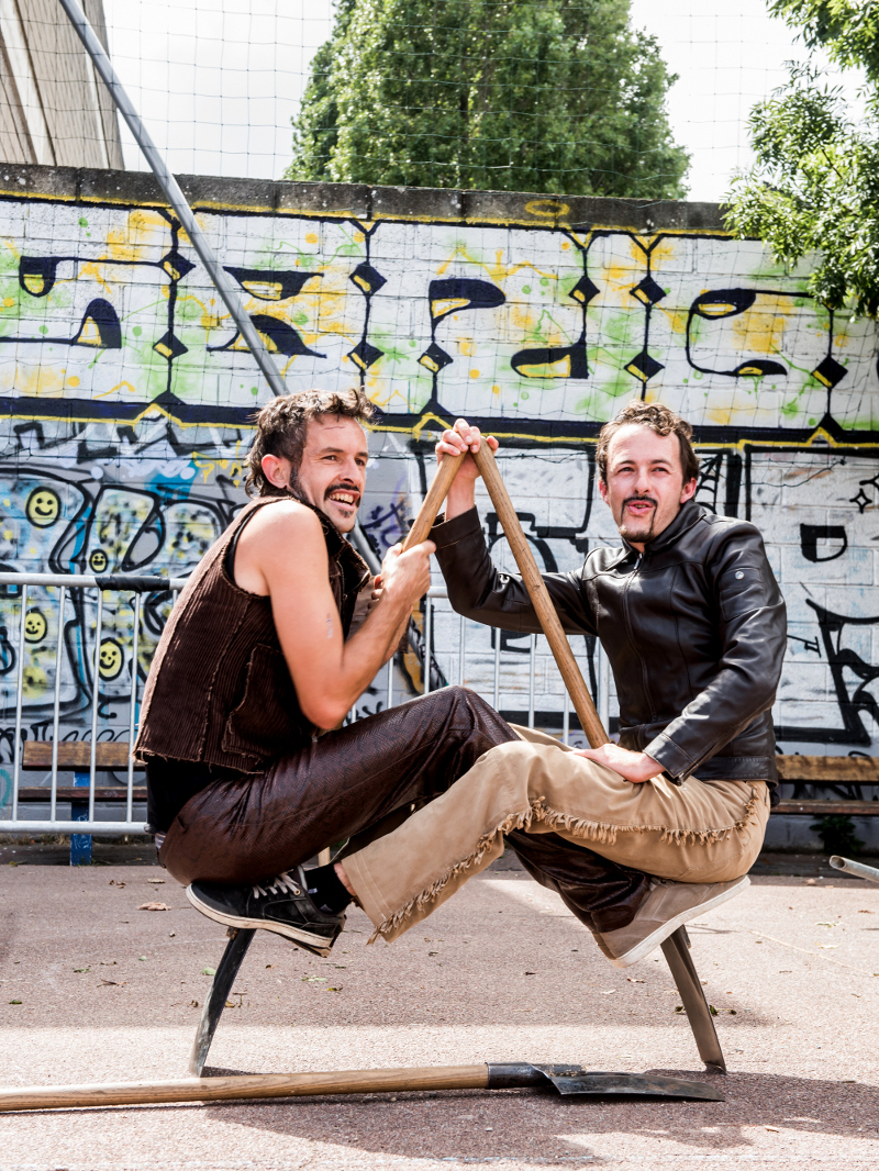 Deux frères, Ringo et Glad pour les copains. Ils sont de passage. Ils ont envie de vous montrer ce qu’ils savent faire. Juste comme ça, vite fait. Et bien que ce ne soit pas si bien ficelé que ça, ils ne lâcheront rien ! Le tout, c’est de ne pas perdre le fil du chewing-gum ! Gum over est une performance de cirque mêlant le clown et la jonglerie autour d’agrès tels que la pelle bèche et la barrière.