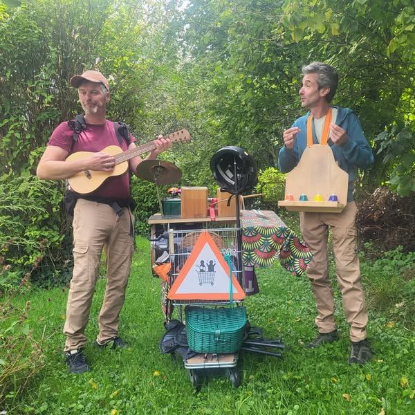 Nafilo, c’est un duo complice venu du monde d’Olifan, qui mêle comédie et musique dans un cabaret nature et mobile. Avec Brindille et Marmule, ils racontent l’histoire d’un p’tit brin d’herbe, portés par leur chariot magique, la Cadiac.